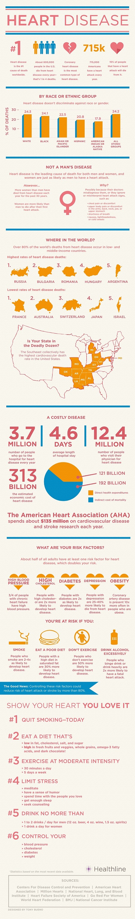 Tim của một người sẽ đập trung bình khoảng 2 tỷ lần trong suốt cuộc đời. Tuy nhiên, bệnh tim và đau tim đe dọa cắt giảm số lần đập này. Đọc các thông số này sẽ biết được bạn có nguy cơ mắc bệnh tim hay không và những gì bạn có thể làm để bảo vệ trái tim của bạn và để sống lâu hơn, sống khỏe mạnh hơn. Dưới đây là một biểu đồ thông tin cung cấp bởi Healthline: